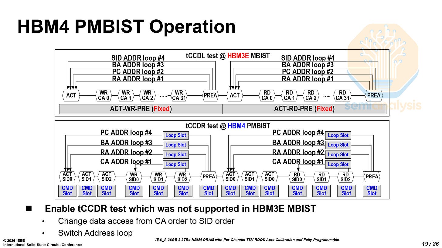 堆叠高度从16增至32层、通道数增加,进一步加剧了这一挑战。随着通道数和堆叠高度增加,芯片间偏差累积,导致更大时序失配,影响可实现的tCCDR和整体HBM性能。