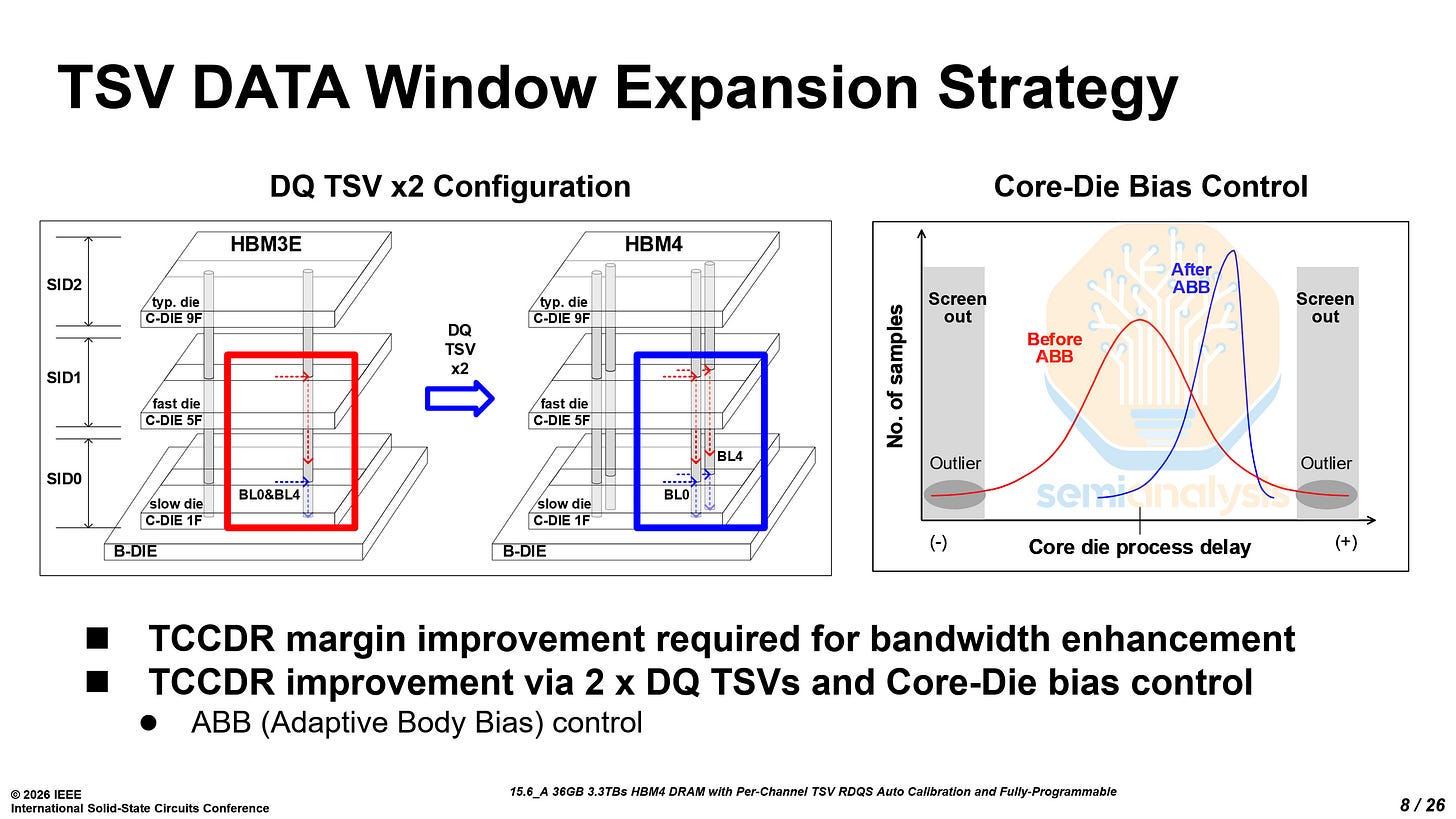 结合自适应体偏置(ABB)控制技术(可缓解堆叠核心芯片间的工艺偏差),以及TSV数量翻倍进一步改善时序余量。三星论文称,ABB和4倍更高的TSV数量使其HBM4引脚速度可达13Gb/s。
