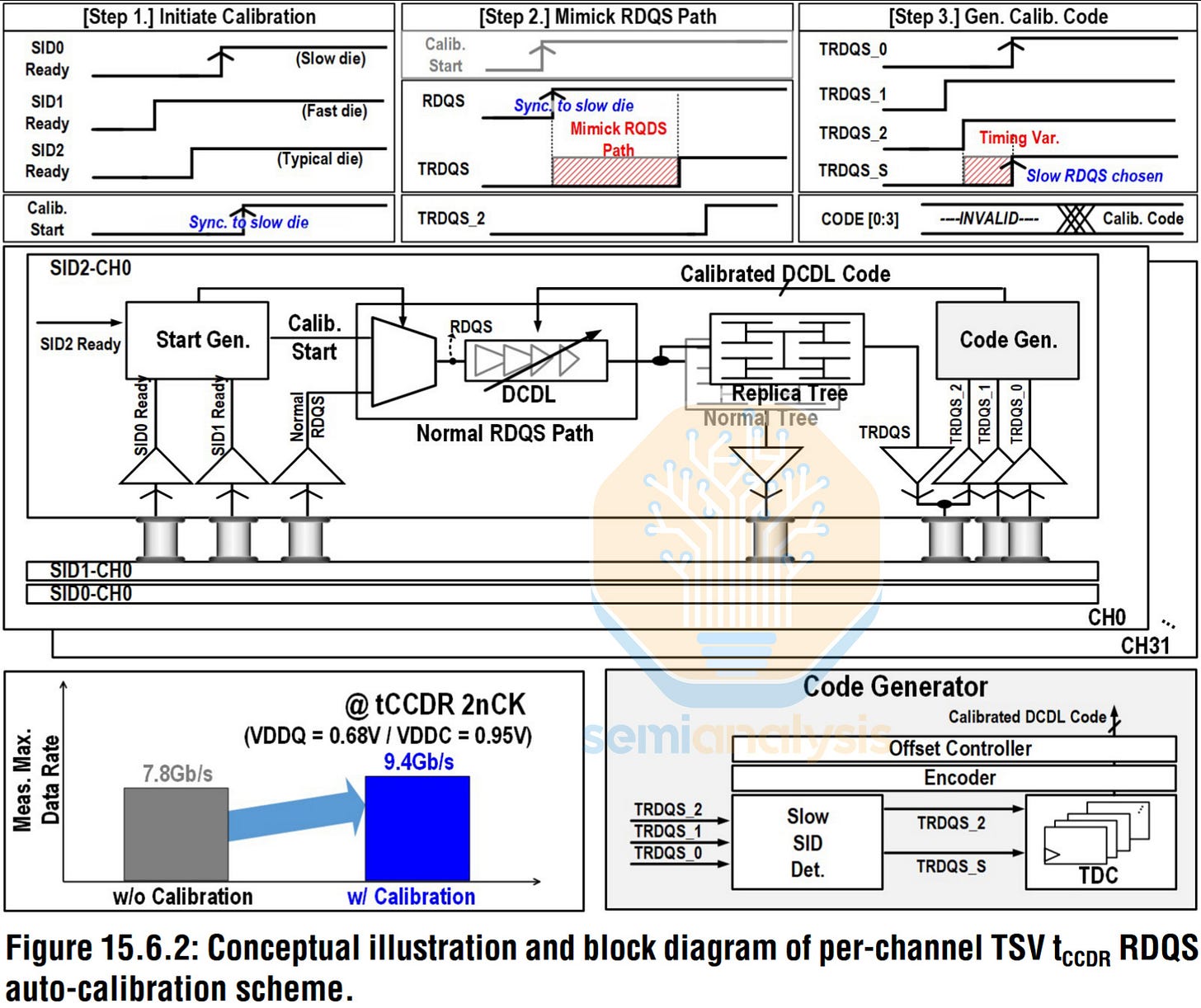 该方案同时处理核心芯片间的全局延迟偏差和局部通道偏差,实现堆叠内时序同步。通过补偿这些失配,三星显著提升有效时序余量,在满足tCCDR约束的同时提高最大数据速率——仅此一项就将数据速率从7.8Gb/s提升至9.4Gb/s。